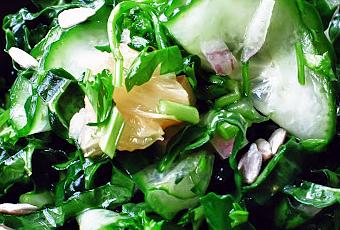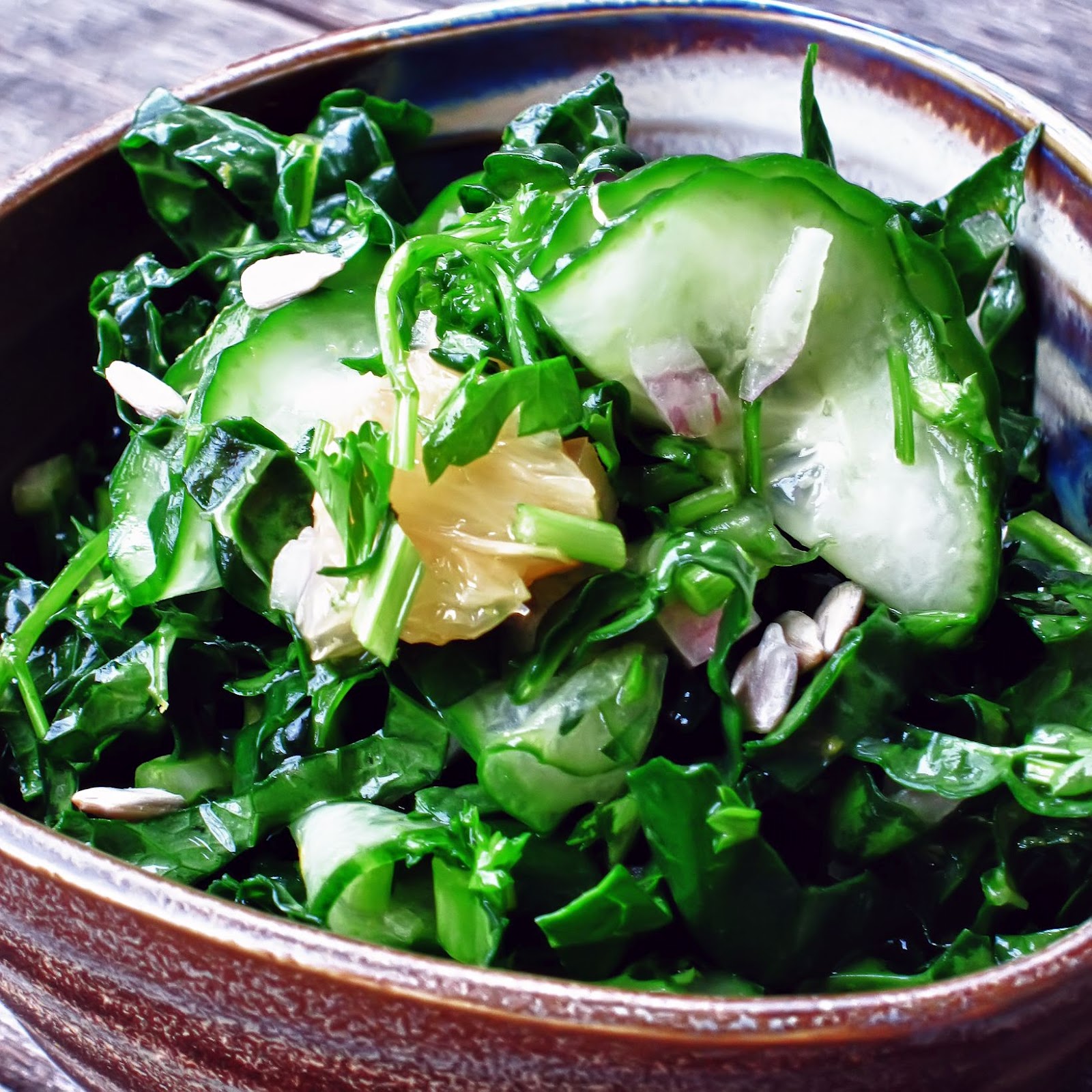 La Salade1/2 bouquet de kale noir1/2 concombre1/2 échalote1 petit pamplemousse1/2 petit bouquet de persilLe zeste du pamplemousse1 cuillère de graine de chanvre2 cuillères de graines de tournesol