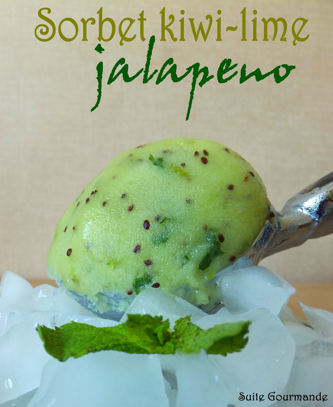 Avec l'arrivée des beaux jours, j'ai ressorti ma sorbetière. Voici ma première ''expérimentation'' de l'été : un petit sorbet bien parfumé et pas trop sucré, inspiré d'un cocktail qui allie kiwi, jalapeno et vodka... Contrairement à ce que l'on pourrait penser, le piment jalapeno reste très discret dans la mesure ou on le sent seulement quand on tombe sur un morceau. Et ce n'est pas trop épicé, alors non, vous n'aurez pas la bouche en feu en dégustant ce sorbet. D'autre part, malgré le fait que mes kiwis étaient ultra mûrs, une pointe d'acidité persiste, cependant je laisse les quantités de sucre telles quelles car il s'agit avant tout de consommer un dessert à base de fruits et non pas de sucre (à doser donc selon vos goûts)...! Au final le tout reste très concluant.