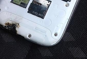Alors que mon téléphone était placé dans un réceptacle du tableau de bord, une flamme blanche ainsi que des étincelles accompagnés d’une détonation m’ont obligé à me ranger sur le bas-côté de la route. Le téléphone était alors dans un état semi-fonctionnel : il ne capte plus aucun signal radio.