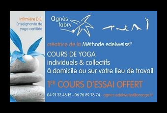 Des cours à domicile (individuel) ou collectif (on peut organiser des séances collectives entre ami(e)s ou même sur son lieu de travail pour un instant détente) pour une relaxation totale du corps et de l'esprit. Une méthode globale différente de celle du yoga traditionnel qui associe des mouvements doux d'assouplissements et d'étirement des muscles internes, une respiration légère et posée suivis de postures de yoga qui permet de retrouver un véritable équilibre entre relaxation et tonicité. Une séance en privé où notre petit corps tendu, stressé ou fatigué passe par plusieurs phases évoluant progressivement par un relachement des tensions, une impression d'allongement agréable de tout le corps jusqu'à sentir progressivement cette évasion intérieure envahir tout notre petit être (les baillements rêveurs deviennent soudain nos meilleurs amis). A l'image de sa créatrice le Yoga Edelweiss est un patchwork du parcours d'Agnès, danseuse professionnelle, infirmière DE (à l'écoute de l'architecture corporelle), professeur de yoga certifié. Un moment rien que pour soi à découvrir absolument (le 1er cours d'essai est offert) à tous ceux qui voudraient monter sur les hauts sommets de l'évasion pour sentir le doux parfum de l'Edelweiss.
