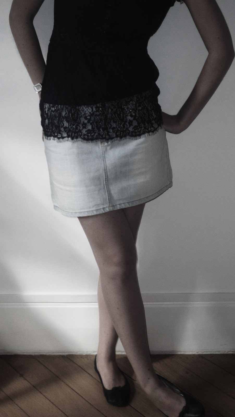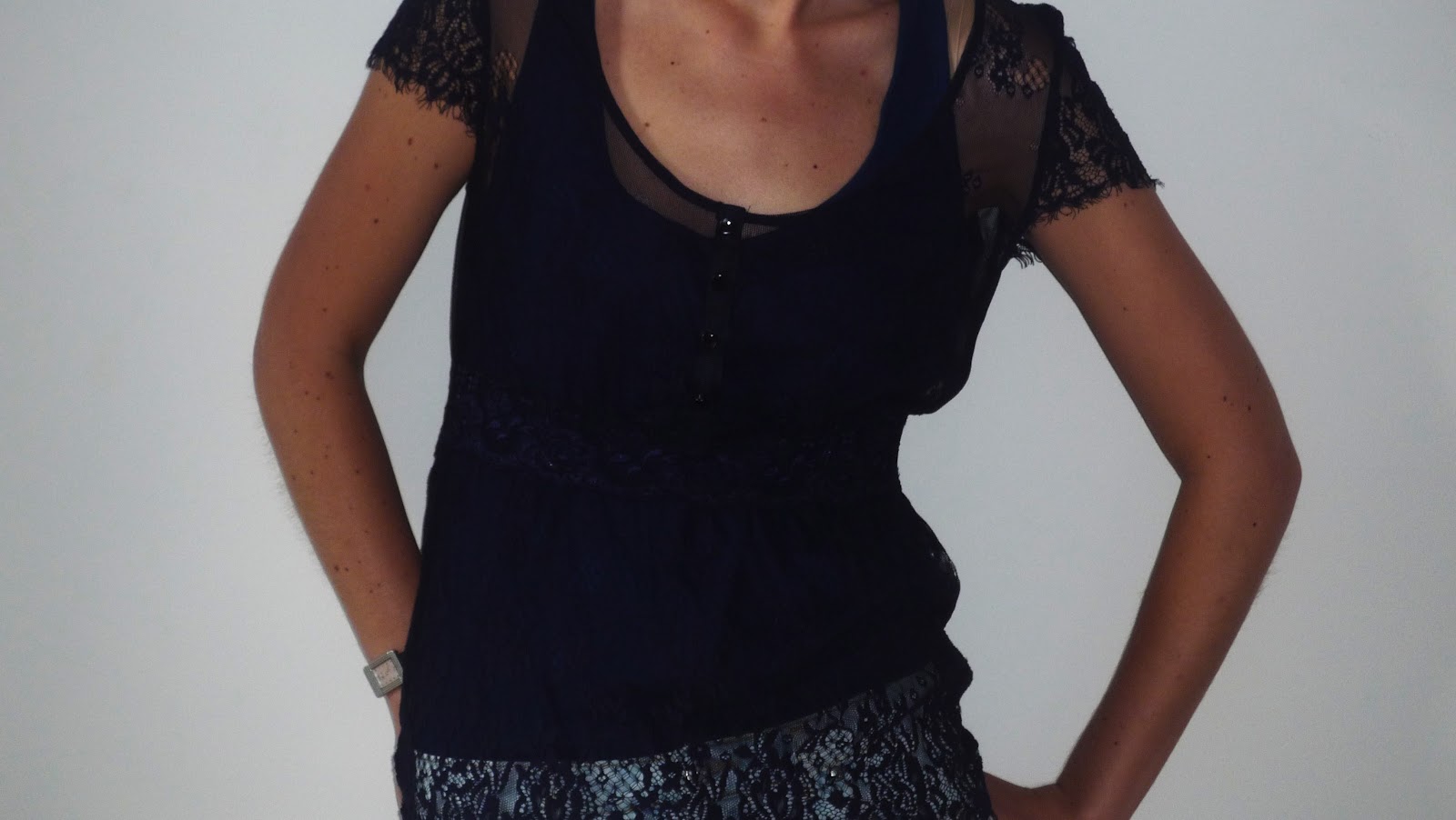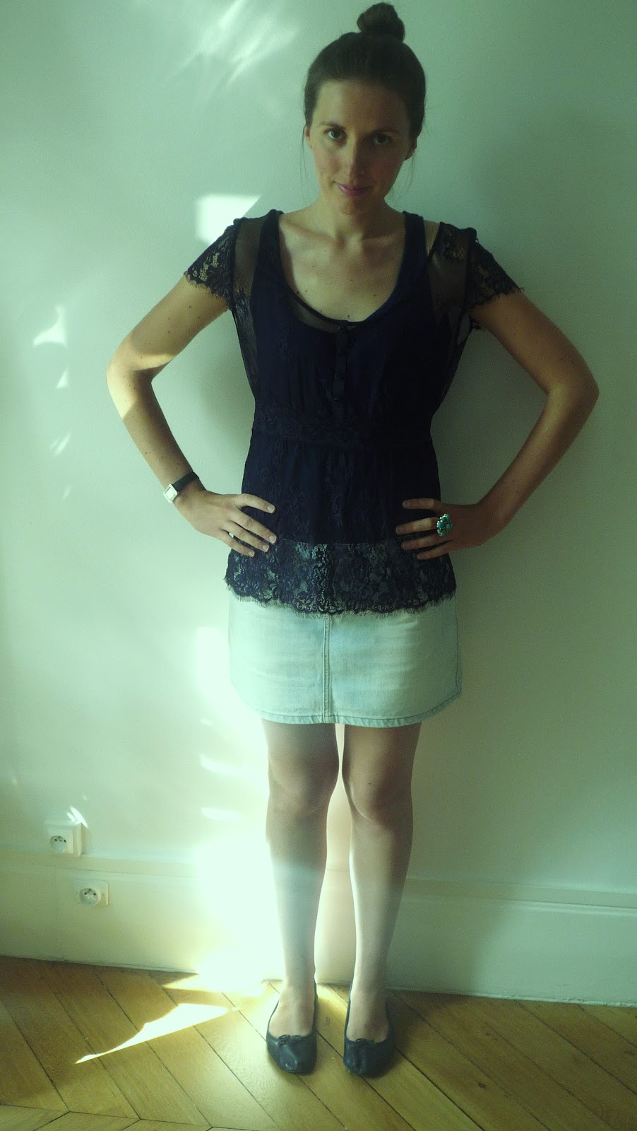 Dans un dégradé de bleus, elle associe un joli top dentelé (associé à un débardeur, histoire de ne pas choquer la bienséance!) à une jupe bleu glacier. C'est décontracté mais avec ce je ne sais quoi de chic et de féminin apporté par la dentelle.