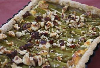 Etaler la préparation sur la pâte. Arranger les asperges égouttées. Répartir les noisettes.
