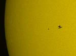 Passage de l'ISS devant le Soleil. A droite de l'ISS, la navette Atlantis, laquelle vient de se séparer de la station et s'apprête à rejoindre la Terre. Distance d'observation : 500 km. Vitesse : 7,4 km/sec. Taille de l'ISS : 73m. Distance entre l'ISS et Atlantis : 200m.
