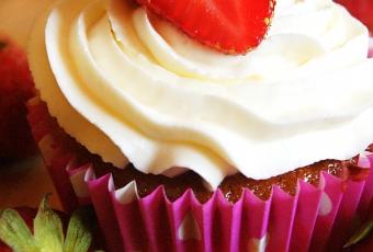 A l’aide d’une poche à douille, déposer une jolie rosasse sur chaque cupcake puis une demi fraise.