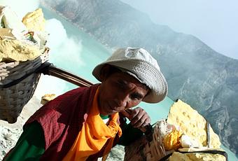 Au coeur même du cratère du kawa Ijen, où demeure le lac le plus acide au monde, des hommes extraient des blocs de soufre, résultats de la cristallisation du minerais contenu dans les fumerolles qui s’échappent du volcan. En plus des émanations très nocives pour leur santé, ils portent en moyenne 80-90 kilos sur leurs épaules pendant 2 km à flanc de cratère.