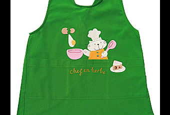 Tous les personnages et petits détails sont découpés à la main, aplliqués et brodés. Les tabliers sont de taille unique mais leur coupe originale s'adapte à la morphologie des enfants de 2 à 6
