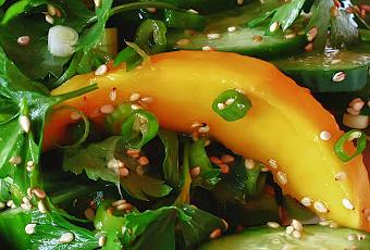 1 mangue ataulfo1 concombre libanais1/3 d'une petite botte de persil plat1 cuillère à soupe de graines de sésame (15 ml)3 échalotes longues et fines (ciboule)Le jus d'une demie lime (citron vert)Fleur de sel