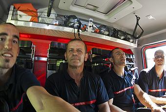 Portraits de collègues au retour d'une intervention. De droite à gauche : Fabien, Frédéric, Pascal, et moi-même Matthieu.