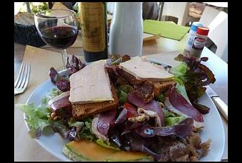 Donc, dans le désordre, il y a, dans cette salade (tarifée à 14€) : de la feuille de chêne fraîche, de la fondue d'oignons doux, des cerneaux de noix, une fine tranche de melon, des morceaux de tomates non pelée, des languettes de filets de canard fumé et deux tranches de foie-gras mi-cuit disposées sur de fines tranches de pain d'épices. Le tout avec une vinaîgrette légère ...; Avec, pour déguster, un peu de vin de Pécharmant, la "cuisse de Pécharmille" ...Romantique tout ça ? Les Americains n'ont qu'à bien se tenir.