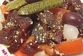 Décorer d'olives violettes, d'oignons blanc et de cornichons.