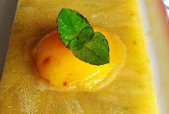 tranches de pêches et des feuilles de menthe. Servez en coupant des