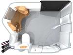 L’équipement Cosy Corner comprend une partie d’accueil avec miroir et deux prolongements latéraux, dans lesquels viennent s’intégrer le lavabo et son mitigeur d’un côté, des tablettes de rangement de l’autre. L’emplacement de la vasque a été adapté en conséquence. La profondeur a elle aussi été étudiée pour permettre de ménager une hauteur relativement importante sous le plan-vasque et donner un accès plus facile et proche du plan de toilette. Cet encombrement réduit résout un problème de taille récurrent : la personne en fauteuil peut s’approcher au plus près de la vasque et du mitigeur pour une accessibilité totale.