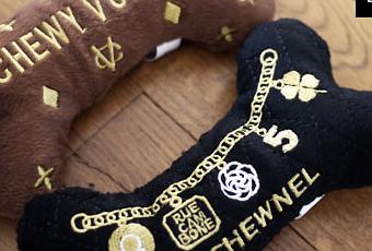 Parfait pour les chiens de petites et moyennes races, ces jouets en peluche avec pouet-pouet, sont solides, doux et BLING BLING puisqu’ils sont une parodie de grande marque de luxe (Vuitton et Chanel pour ne pas les citer :)).