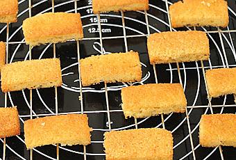Dans un saladier, mélanger la farine, les amandes et le sucre. Ajouter les blancs d'oeufs légèrement fouettés. Incorporer le beurre fondu, mélanger et rajouter la vanille.