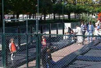 Il n’y a pas que des bassins aux Tuileries, ni le Louvre ou la Concorde à chaque extrémité. Bon il vrai que tout est splendide, qu’on se prend à rêver au fait que l’on est dans des jardins royaux mais nos chères têtes blondes, elles, gardent en eux cette capacité à s’ennuyer nous rappelant à l’ordre. Alors on file aux Trampo. Les voilà donc en chaussettes ou pied nus à rebondir sur de petits trampolines individuels, riant, tombant… Bref, vidant un trop plein d’énergie. Pendant ce temps-là, c’est le moment pour nous de bouquiner tout en n’oubliant pas de les admirer tout de même… Juste à côté, un espace avec des jeux, tourniquets, pont en corde, et drôles de balançoires finiront de les contenter à moins qu’on ne cède aussi aux supplications pour un tour de manège ou une ballade en poney…