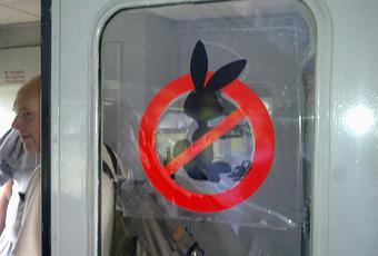 Zaïtzev signifie le lièvre, cela désigne aussi les resquilleurs dans les trains. Ils sont nombreux a vouloir ainsi économiser le prix du billet, il faut pour cela passer par des trous dans les clôtures, traverser les voies de chemin de fer pour éviter les portillons et les agents de sécurité qui les surveillent. Mais à bord des trains non plus ce n’est pas de tout repos, en effet vous pouvez voir ce signe, qui ne signifie pas que les portes peuvent pincer les doigts à l’instar du lapin du métro parisien. Non ce lièvre signifie interdiction de resquiller, de boire, de fumer et de jeter des ordures et de faire les quatre ensemble.