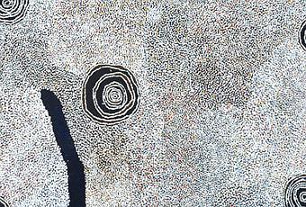 Dans cette toile, c’est sa région natale qui l’inspire et il y met en scène une série de points d’eau situés dans les Olgas : ils sont symbolisés par les trois cercles concentriques dont la série