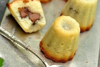 Beurrer les moules à financier, les remplir à moitié puis ajouter des morceaux de chocolat et recouvrir du reste de la préparation.