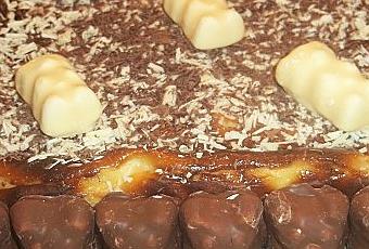 Faire fondre les nounours au chocolat blanc au bain-marie et ajoutez - les à la faisselle, bien mélangez et versez ce mélange sur la croûte spéculoos-petit beurre et cuire à four chaud th.7 pendant 50/55 mn.