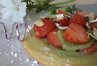 Couper 1 kiwi et 2 fraises par tartelette en lamelles et réservez .