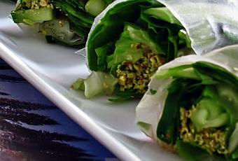 C'est dans des rouleaux garnis de verdures que j'ai préféré cette préparation à base de noisettes et coriandre. Des petites feuilles de riz, des feuilles vertes (roquette, mizuna, feuilles de radis, chou bok choy... ), une cuillère de pâté végétal et le tour est joué.