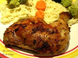 Cuire environ 1 heure 15 ou plus selon la grosseur ou jusqu’à ce que le poulet soit cuit ou atteigne la température 180° F ( 80°C ) avec une sonde thermomètre en l’arrosant une fois avec la marinade restante.