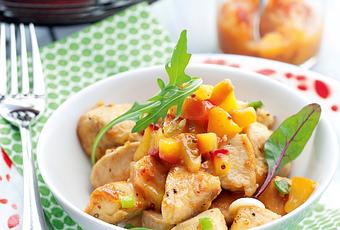- Répartir le poulet dans des assiettes creuses, disposer une belle cuillère à soupe de chutney tiède sur les assiettes et déguster le poulet accompagné d’un riz blanc basmati