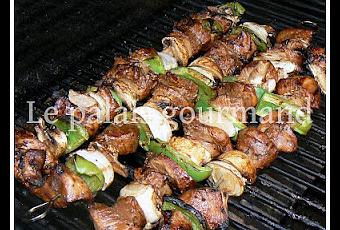 Mélanger tous les ingrédients, verser sur les cubes de poulet et faire mariner au moins 5 heures ou 1 journée entière. Embrocher avec des légumes divers et badigeonner au cours de la cuisson.