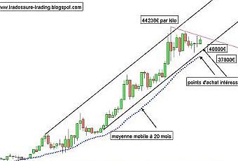 Notre partenaire tradosaure nous livre, lui, ses analyses à court termes sur le marché de l’or. On notera au passage que le graphique est désormais exprimé en euro/kilo et plus en dollar : les investisseurs effectuant davantage leurs achats en euro et non avec le billet vert.