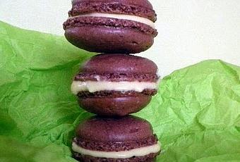 Macarons Au Chocolat Coques: 110g de poudre d'amandes-220g de sucre glace-20gde cacao non sucré-4 blancs d’œuf (vieux de plusieurs jours et à température ambiante) 40g de sucre-20gouttes de colorant rouge- Ganache Passion:150g de chocolat de couverture blanc-50g de pulpe de Fruit de la Passion*-20g d'écorce d'orange confite-60g de crème liquidePréparer la ganache(La veille) en faisant fondre le chocolat blanc au bain-marie. Faire bouillir la crème fleurette et verser en 2 fois sur le chocolat fondu en émulsionnant , puis ajouter la pulpe de passion et de très petits cubes d'écorce d'orange confite. Bien mélanger et mettre au frais.Préparer vos coques: chauffer le four à 150° Mixer la poudre d'amande+ le sucre glace et le cacao. Mettre sur une plaque et enfourner 5mn. Tamiser le tout. Monter les blancs d’œuf à grande vitesse en y ajoutant 1càc de crème de tartre (ou quelques gouttes de citron + sel) dès qu'ils moussent, y ajouter le sucre et continuer de battre jusqu'à obtention d'une neige ferme (formation d'un bec au bout du batteur) . Ajouter en dernier le colorant (facultatif)