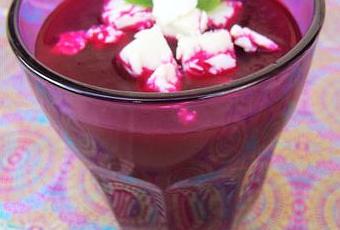 L'été revient à Toulouse, il aura quand même fallu attendre la fête du 14 juillet (et le chouette concert de Zebda :)!) pour voir pointer les rayons de soleil. Du coup, après le potage aux lentilles corail proposé il y a quelques jours, je passe en mode cool summer pour réaliser un velouté froid type gaspacho, très coloré et tout simple à faire. J'avais utilisé des betteraves longues trouvées dans mon panier, que l'on appelle aussi betteraves crapaudines. C'est une variété ancienne, avec une longue racine à chair rouge, presque noire. Cette variété est très parfumée, a un peu moins le goût de terre qu'on rapproche parfois à la betterave ; elle est aussi très colorée, peut-être même plus que la betterave ronde.