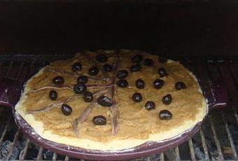 Etaler votre pâte à pizza, étaler dessus les oignons refroidis, mettre des anchois et des olives noires.