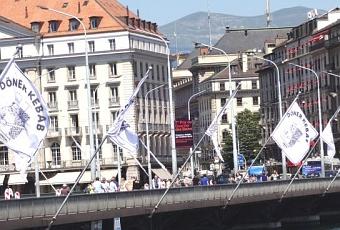 Tout est dans le décalage et la dérision. Le kebab a bon dos! Après l’autopub de la société d’affichage SGA en 2009 qui a envahi les rues de la Suisse avec l’opération “Ali kebab”, place à l’art qui s’empare du symbole fastfood le plus répondu à travers le monde. Depuis hier des drapeaux blancs avec l’effigie d’un vendeur de kebab ornent les 2 côtés du Pont du Mont-Blanc. Un vendeur hilare qui coupe de la viande et un titre “Döner kebab” pour illustrer le prix du “Quartier des bains” 2012 attribué à l’anglais Jonathan Monk. Ce moyen de communication de l’association du Quartier des Bains existe depuis 2006. Vous pouvez voir ici celle consacrée au lauréat de 2011, Matthieu Vertut. La démarche de l’artiste anglais est simple, en détournant les symboles existants ses copies deviennent elles-mêmes des oeuvres qui peuvent susciter des réactions auprès du public. Les drapeaux de Jonathan Monk seront visibles jusqu’au 29 juillet et réapparaîtront du 13 au 26 août. Allez un kebab pour la route! Le débat est ouvert!
