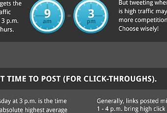 L'infographie suivante présente des données empiriques qui ont été compilées grâce au service de tronquage d'url - Bitly. Le but est de démontrer quel est le meilleur moment de poster une actualité sur Facebook et Twitter dans le but de générer un maximum de clics (et donc du trafic vers un site web).