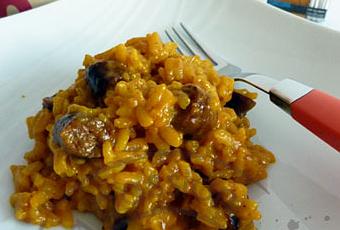 Chauffez le bouillon dans une casserole. Coupez les merguez en morceaux, mettez les à cuire 5 à 6 minutes à la poêle à feu moyen avec l’huile d’olive. Retournez les régulièrement. Réservez les. Récupérez le gras de cuisson des merguez dans une casserole. Faites fondre l’oignon et l’ail 3 minutes que vous aurez au préalable épluchés et hachés. Ajoutez le riz, nacrez le puis versez le vin blanc. Laissez cuire jusqu’à évaporation, salez et poivrez. Versez 30cl de bouillon sur le riz, poudrez de piment et de curcuma, laissez cuire 17 à 18 minutes en versant le bouillon au fur et à mesure qu’il est absorbé. Pour la cuisson du riz, n’hésitez pas à gouter. En fin de cuisson ajoutez les merguez. Éteignez le feu, ajoutez le beurre froid en morceaux et le parmesan. Enrobez le riz, couvrez et laissez reposer 2 minutes et servez.