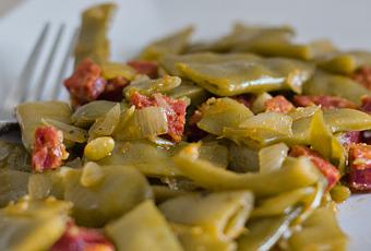 1kg de haricots plats coupés surgelés, 1 oignon, 200g de chorizo, 25cl de bouillon de légumes, huile d’olive, sel, poivre.