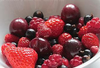 L'aspect pimpant de ce bol ne doit pas vous leurrer. La saison printemps-été 2012 n'a pas donné grand chose du côté des fruits rouges. Les fraises mûrissent au compte-gouttes ; les framboises n'ont fait presque que de la feuille, le cassis a été bien clairsemé. Quant aux groseilles, c'est simple, il n'y en a point eu : les fleurs n'ont pas résisté aux intempéries. Cette semaine, d'horribles petites chenilles sont venues dévorer les feuilles d'un jeune plant. Le groseiller à maquereau était assez bien parti, mais une tondeuse lui est passée dessus fin avril, il s'en remettra, au mieux, l'année prochaine. Au diable le soit-disant jardinier qui a commis un tel forfait (et qui, par ailleurs, ne s'attaquerait pour rien au monde aux mauvaises herbes, aux iris défleuris, à la taille du tamaris...)