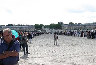 Après une nuit à Evreux, me voilà reparti vers Paris et plus précisément le château de Versailles. Je dois avouer n’être que peu intéressé par le lieu mais plutôt par l’exposition d’art contemporain qui y trouve place tout les ans. J’ai vu à la télé il y a quelques semaines une interview et les oeuvres atypiques de l’artiste portugaise Joana Vasconcelos*, ça m’a vraiment donné envie d’aller voir sur place mais une queue de plusieurs centaines de mètres à l’entrée du château me décourage…Je suis sur le point de renoncer, n’ayant aucune envie de passer 2 heures à attendre pour entrer mais je me ravise. Je suis là, j’ai le temps (je me le prends!) Je gare ma moto et je me lance…