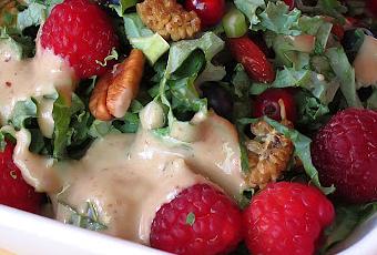 Couper le kale en fines lanières et mélanger le délicatement avec les petits fruits, les baies de goji, les pacanes et les mûres blanches.