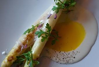 Encore un menu très printanier, avec pour entrées Riz d'agneau / P'tits pois / Œufs de truite, ou Betteraves nouvelles / Fromage frais / Oseille (photo), ou Asperges blanches / Parmesan / Lard (photo).