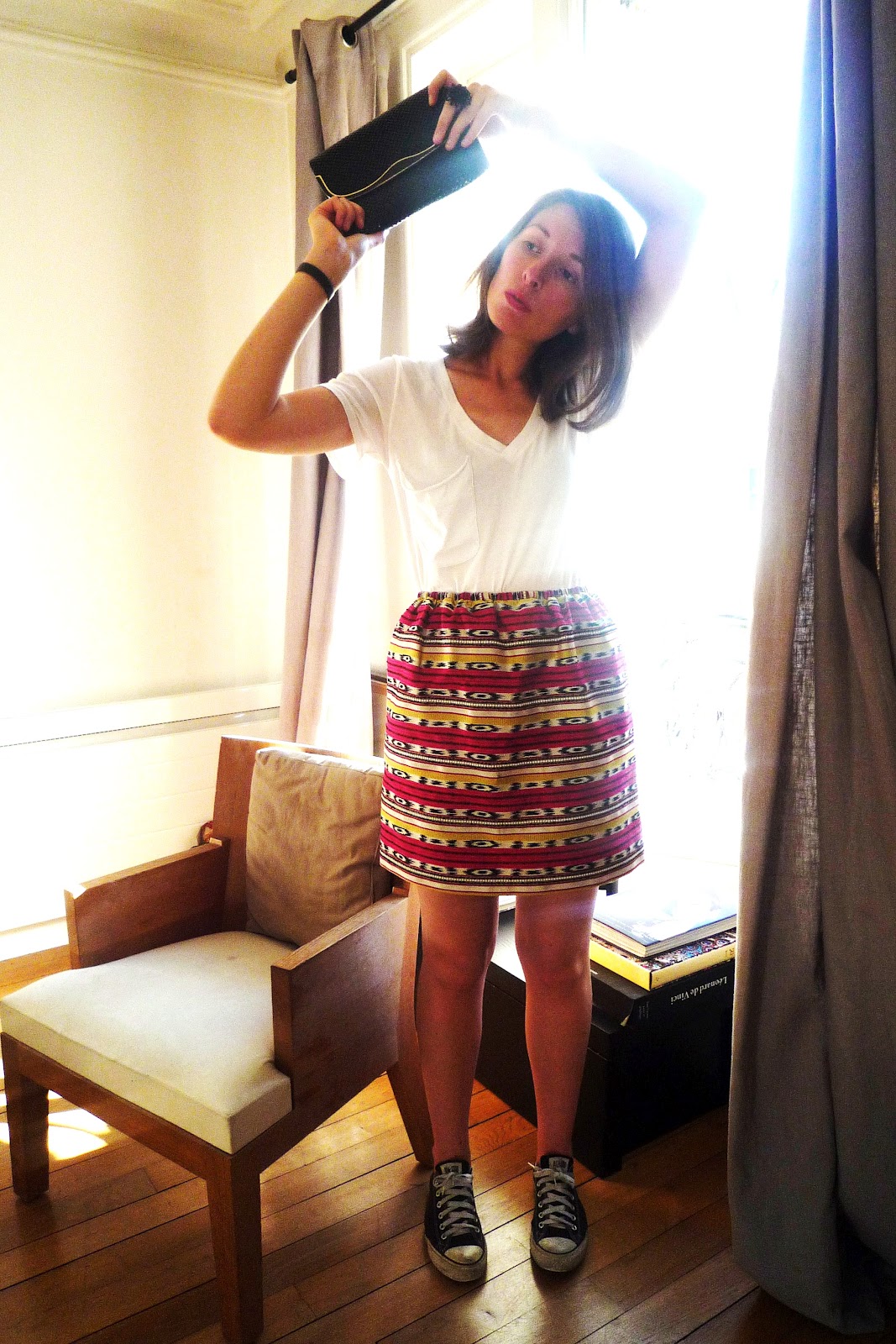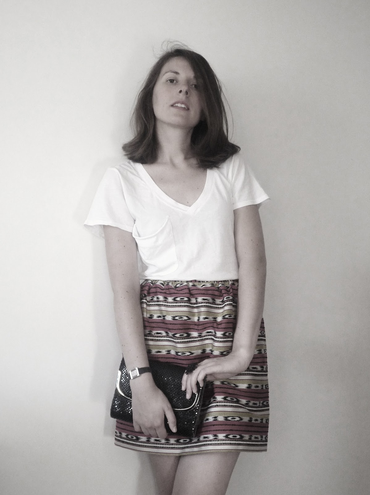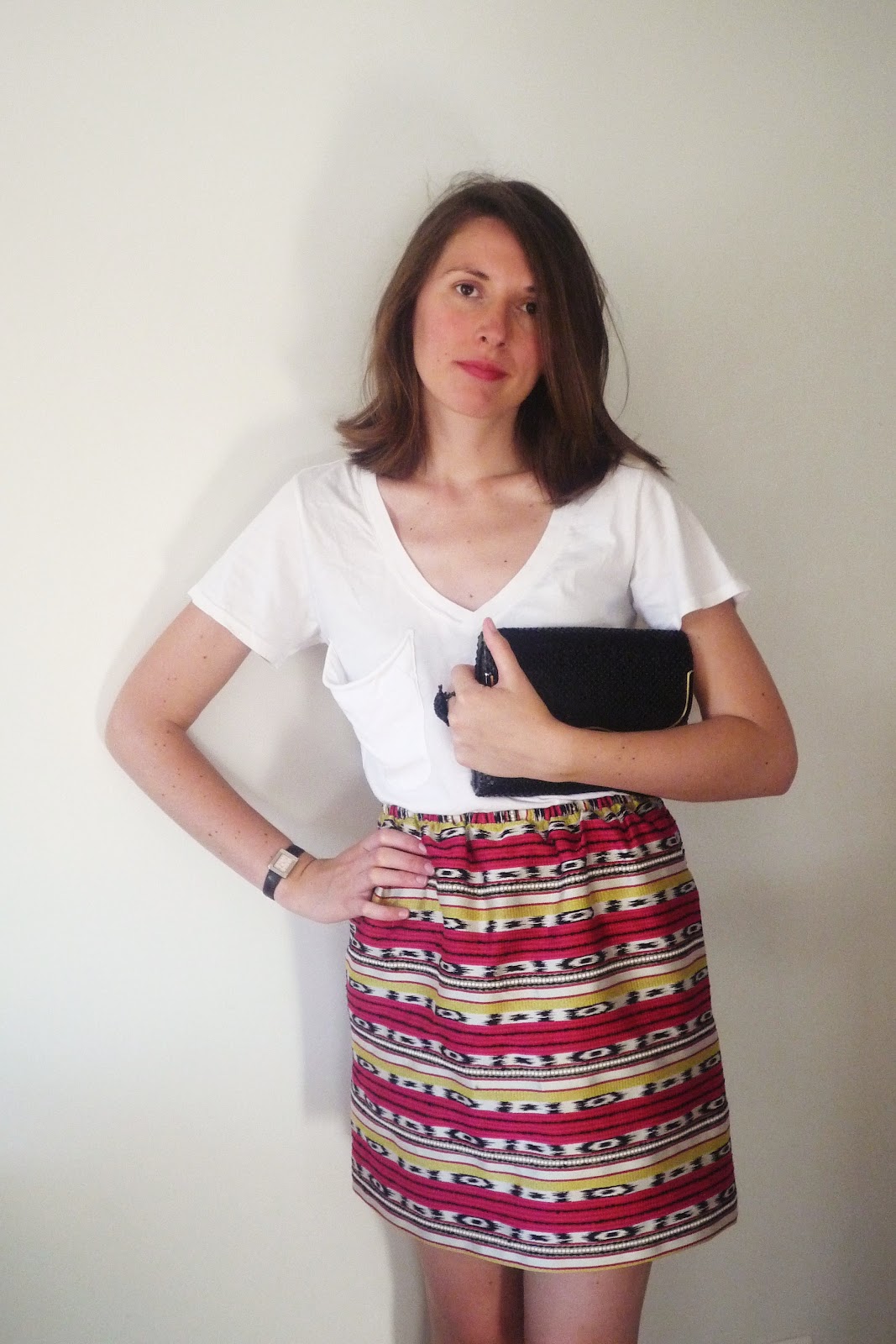 Une allure décontractée mais pas de laisser-aller, au contraire: la jupe apporte couleurs et vivacité et la pochette détonne et donne, finalement, la possibilité à cette tenue d'être portée le soir pour une petite soirée "chillin"!