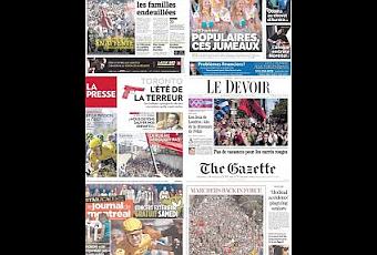 Quatre des premières pages mentionnent la manifestation importante d'hier. Deux l'ignorent complètement. Il s'agit évidemment des quotidiens du groupe Quebecor. Qu'y avait-il de si important hier à Montréal pour ignorer une marche de 50 000 personnes? Il y avait le festival Juste pour Rire, dont on parle en Une des deux quotidiens de Quebecor. Que le festival de M. Rozon (grand pourfendeur du mouvement étudiant) se retrouve ainsi publicisé gracieusement par les quotidiens qui ont le plus ignorés (et dénigrés) le mouvement n'est certainement pas une coïncidence, puisque par hasard, les vedettes du Star Académie de Quebecor convergeront justement pour nous faire rire (?) dans un spectacle offert par le festival en question (voir Une du JdeM).