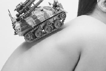 Certains des artistes contemporains plus jeunes (et souvent inspirés par leur position dans la diaspora, entre les deux rives) sont, eux, animés par la tension entre individuel et collectif, par leur lien au monde et la reconnaissance de la mémoire. C'est le cas de Mounir Fatmi et de ses versets du Coran écrits sur des néons, à la fois impératifs et éphémères, versets ambigus car polysémiques. C'est le cas de la jeune Tunisienne Dora Dhouib (auteur d'un bel alphabet sensuel et féministe) dont le dos nu parfait (en haut) est escaladé par un char, confrontation de la femme et du pouvoir, de la liberté et de la répression, de la beauté et de la violence. C'est le cas de la photographe tunisienne Nicène Kossentini qui décline de manière très rigoureuse et réfléchie des élévations vers le ciel : une antenne de télévision, un minaret, des gratte-ciels (communication, religion, économie, évidemment) et un jeune garçon les yeux levés, plein d'espoir ou de crainte. C'est aussi le cas des corps voilés comme des chrysalides de Meriem Bouderbala.
