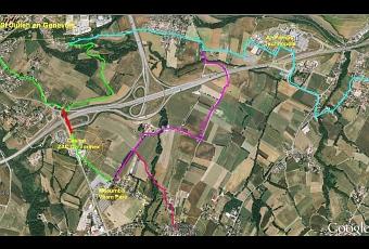 Le tracé vert relie Vitam Parc à St Julien. Ce tracé intègre la construction d'une passerelle au dessus de l'autoroute. En effet, le problème de notre territoire est qu'il lui manque un lieu de franchissement de l'Autoroute Blanche qui serait réservé à la mobilité douce (piétons, vélos, voire chevaux). C'est pourquoi nous recommandons la construction de cette passerelle qui résout tous les problèmes liés à l'aménagement d'un plan ambitieux de mobilité douce sur le territoire, et en particulier le franchissement d'une voie d'acces à l'autoroute.