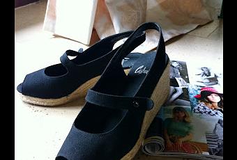 Compensées, à la semelle en paille, en toile noire. Voilà quels étaient mes critères. Critères minutieusement respectés, mais avec une touche tellement années 30, grâce à la petite bride à bouton. A porter avec un jeans négligemment retroussé et une grande chemise à la B.B. ou avec une jolie robe à dentelles très dolce vita.
