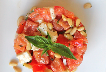 Ingrédients pour 1 tartare individuel : - 2 tomates "grappe"- 1 c à soupe de cubes de fêta (j'en ai trouvé marinés en bocal en verre au rayon fromage d'un GMS)- 1/2 oignon nouveau - 1 c à soupe de pignons de pin - 1 c à soupe d'huile d'olive- quelques feuilles de basilic frais- sel et poivre du moulin