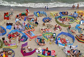 La rive, la côte, la mer, la bronzette. Une photo comme une autre de l'ethnographie touristique qui vit le jour sous nos tropismes, vers Napoléon III, je crois. Les stations balnéaires faites d'accumulation de touristes, de papiers gras, de villas, de sommeil coloré sont des stations couchées. On enfile les kilomètres pour s'échouer, croisière immobile, dans le musée proustien des bains de mer, à jouer les éternels oncles de Tati dans des hôtels tout aussi éternellement surannés. Le vent l'emportera dans le sens de gagnera. On joue à s'ensevelir dans le sable comme dans une performance d'art contemporain. On joue, on joue. Ludions ludiques. On tourne le dos à la Terre qui est très sismique en ce moment. Le flou de la mer, son improbable recommencement serait comme rassurant. Et surtout d'être à la fois seuls et ensemble devant ce flou et toute cette misère à laquelle on a tourné de dos, derrière nous. La terre qui vacille, on le sent.