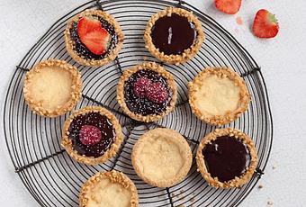 Diviser la pâte en 10 portions et, à l’aide d’un rouleau à pâtisserie, abaisser chacun en un disque d’environ 0,5 cm d’épaisseur. Glisser les disques de pâte dans des moules à tartelette préalablement beurrés et placer 1 heure au réfrigérateur.