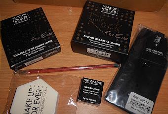 Pour 50 euros, (FDP compris) j'ai eu 6 produits : la palette 4 fards à paupières Rock for ever, un boîtier Rock for ever avec deux star powder que je n'avais pas & des paillettes (que j'avais déjà acheté à Sephora à 20euros le petit pot donc super contente), une pochette à pinceaux, dont je ne me servirai pas car elle n'est pas assez longue et mes pinceaux dépassent, des éponges pour appliquer le fond de teint et un crayon gris.