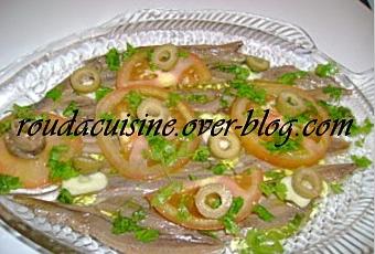 Préparation:Faire dessaler les anchois. Sous le robinet d'eau, nettoyer l'intérieur et l'extérieur en grattant doucement avec les doigts, ensuite les séparer en filets . Les rincer délicatement à l'eau froide, les égoutter et les mettre sur du papier absorbant. Aligner les dans un plat, disposer dessus des rondelles de tomates, saupoudrer de persil et d’ail haché, arroser d'huile d'olive et de vinaigre.